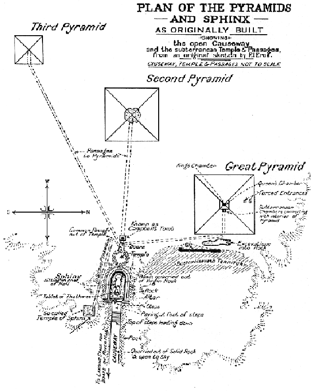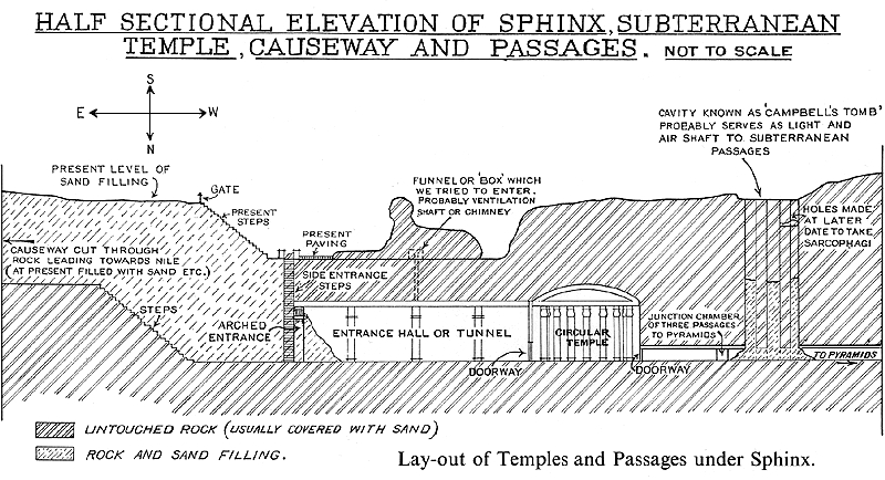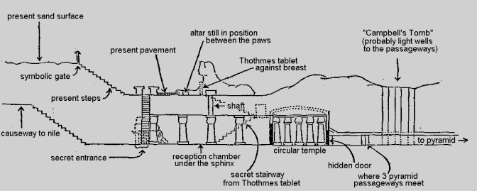 There are still many stories told and many secret or private explanations, accompanied with diagrams and architectural designs, given about the passageways connecting the Sphinx with the Pyramid, and these give color to many strange incidents referred to in the secret writings of the Ancient Egyptians. Some of these underground passageways and their connections are shown in the accompanying diagrams.