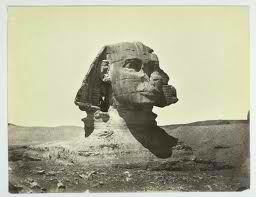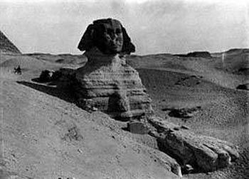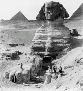 • We stop before a Sphinx; it fixes us with a terrifying stare. Its eyes still seem full of life; the left side is stained white by bird-droppings (the tip of the Pyramid of Chephren has the same long white stains); it exactly faces the rising sun, its head is grey, ears very large and protruding, its neck is eroded; from the front it is seen in its entirety thanks to great hollow dug in the sand; the missing nose increases the effect. Besides, it was certainly Ethiopian; the lips are thick.