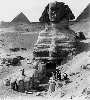 During the past two centuries many have come to study and excavate the monument. These include French scholars accompanying Napoleon’s army in 1798, Caviglia in 1816, H. Vyse in 1840, Mariette in 1853, Kamal and Daressy in 1909 and Baraize in 1926. It was Baraize who first began restoration work, by renovating the head using cement, and clearing the sand completely around the Sphinx.